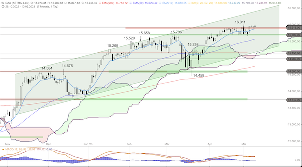 Der DAX pendelt bereits seit mehreren Handelstagen um die Unterstützung um 15.920 Punkte und prallte hier bisher immer wieder im Bereich um den 10er-EMA im Tageschart bei aktuell 15.880 Punkten nach oben ab. Solange der DAX den 10er-EMA weitgehend verteidigen kann, ist mit eher weiter steigenden Kursen zu rechnen.