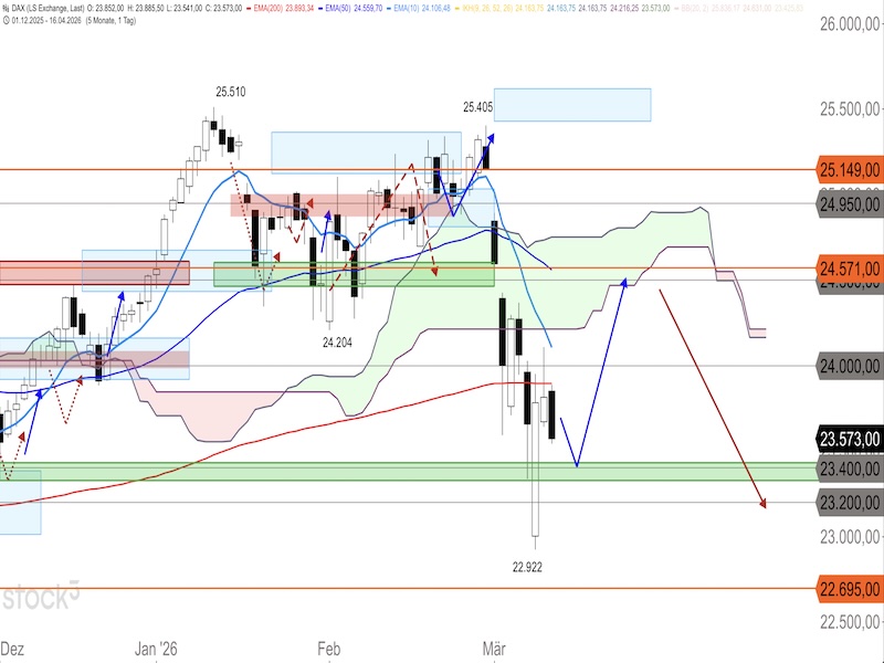 Sollte die Unterstützungszone um 23.400 Punkte vom DAX aufgegeben werden, wäre die nächste Zielmarke bei 23.200 Punkten zu sehen, darunter dann am bisherigen Verlaufstief der Korrektur um 22.922 Punkte. Wahrscheinlich wird der DAX aber dem blauen Pfeil im Chart folgen und nach einem Rücksetzer wieder nach oben abprallen und Kurs auf den 200er-EMA um 23.900 Punkte und die Marke von 24.000 Punkten nehmen. Gelingt hier ein Durchbruch nach oben, wäre das noch offene Gap bei 24.571 Punkten die nächste Zielmarke. In der Folge dieser Erholung ist dann aber mit eher erneut fallenden Kursen zu rechnen, wobei das Tief vom Montag wahrscheinlich unterschritten werden dürfte. Erst nach diesem weiteren Rücklauf sollte dann ein längerfristiger Kursanstieg folgen. Ein langer Bärenmarkt wird aktuell nicht erwartet, lediglich eine scharfe Korrektur.