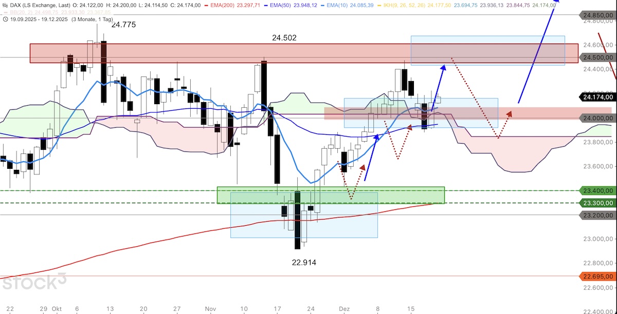 Risikohinweis: Die bereitgestellten Informationen stellen keine Aufforderung zum Kauf oder Verkauf der erwähnten Werte dar. Die besprochenen Wertpapiere sind sehr volatile und risikoreiche Anlageformen. Dies ist keine Anlageberatung, und jede Entscheidung erfolgt auf eigenes Risiko. Hinweis: Stop-Loss-Marken und Gewinnziele dienen lediglich als Orientierung und sollten an das individuelle Risiko- und Geldmanagement sowie die tagesaktuelle Marktentwicklung angepasst werden. Gewinne sollten eigenverantwortlich realisiert werden. Das Erreichen des Kursziels basiert auf dem angegebenen Zielkurs des Basiswerts. Der Autor ist zum Zeitpunkt der Analyse nicht im DAX investiert.