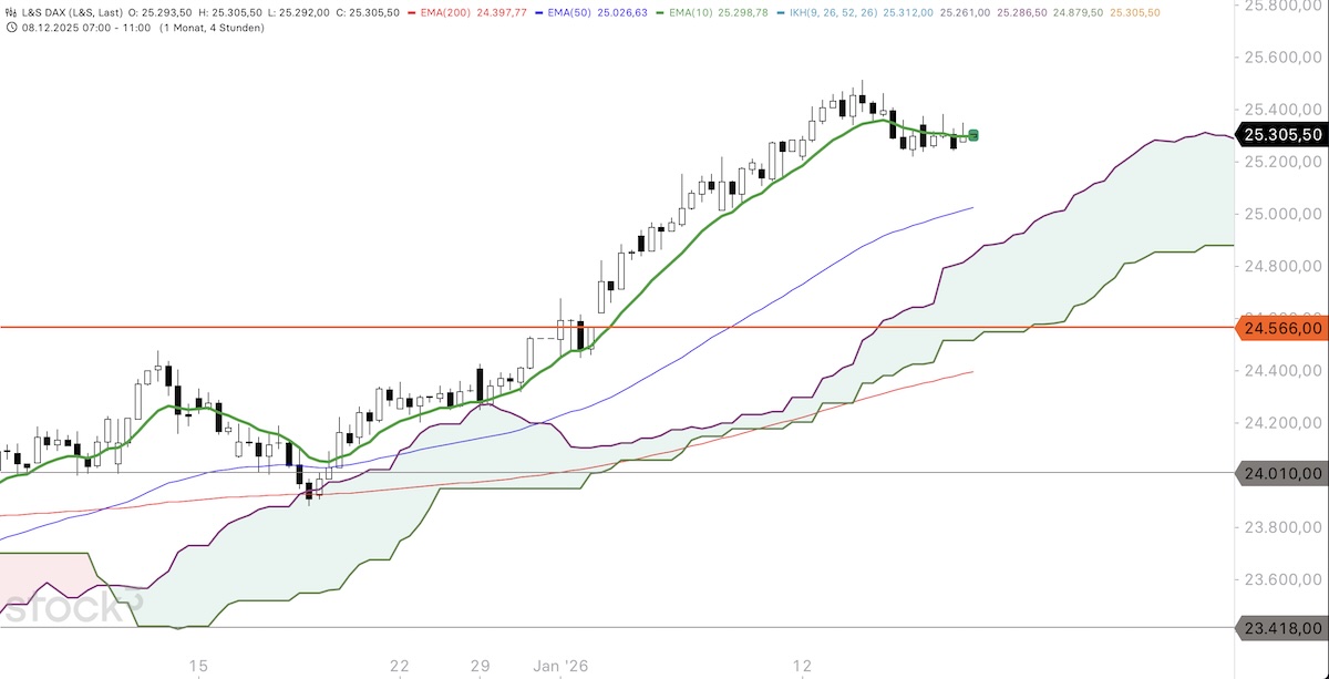 Im 4-Stunden-Chart bewegt sich der DAX weiterhin im Bereich des 10er-EMA, der aktuell bei etwa 25.300 Punkten verläuft. Ein nachhaltiger Durchbruch nach oben ist bislang nicht gelungen, weshalb sich der Index weiterhin im Warnmodus befindet. Immerhin konnte die kleine Unterstützung um 25.240 Punkte bisher verteidigt und als Sprungbrett für einen Erholungsversuch genutzt werden. Gelingt dem DAX der Ausbruch über den 10er-EMA, rückt als nächstes Kursziel das bisherige Verlaufshoch bei 25.510 Punkten in den Fokus, darüber dann die Marke von 25.600 Punkten. Prallt der Index hingegen erneut am 10er-EMA nach unten ab und scheitert an einem nachhaltigen Überwinden, gerät die Unterstützungszone um 25.240 Punkte wieder in den Blickpunkt. Ein Rutsch darunter würde die Wahrscheinlichkeit für eine sich ausdehnende Korrektur erhöhen, mit dem 50er-EMA im 4-Stunden-Chart bei aktuell 25.015 Punkten als nächstem Anlaufziel auf der Unterseite.