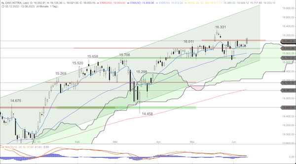 Der DAX konnte am heutigen Montag mit einem Gap-up in den Handel starten und dabei direkt die Marke von 16.000 Punkten überwinden. Im Tageshoch erreichte der DAX 16.126 Punkte und verfehlte damit das auf der Oberseite noch offene Gap bei 16.143 Punkten nur knapp. In der Folge rutschte der DAX wieder ab und zeigt sich aktuell bei 16.080 Punkten tiefer. Zudem mit einer bisher bärischen Tageskerze.