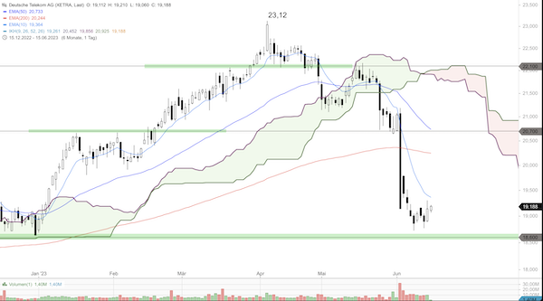 Die Aktien der Deutsche Telekom befinden sich seit dem Verlaufshoch bei 23,12 Euro vom 05. April in einem Abwärtstrend und sind in den Vorwochen kräftig unter Druck geraten. Im bisherigen Verlaufstief erreichten die Titel am 08. Juni 18,72 Euro, konnten sich dann aber fangen und einer Erholung im Abwärtstrend einleiten. Diese sollte im Bereich um den 10er-EMA ihr Verlaufshoch erreichen.