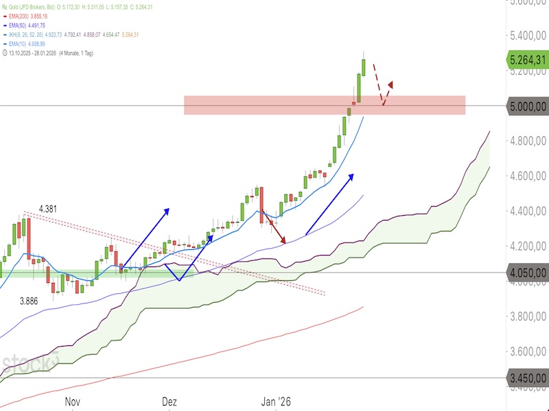 Auch geopolitische Risiken wie Konflikte (Nahost, Iran, Grönland-Zölle) sowie Unsicherheiten um die Unabhängigkeit der US-Notenbank Fed sowie mögliche Shutdowns treiben die Gold-Nachfrage an, da Gold weiterhin als "sicherer Hafen" gesehen wird. Das Edelmetall sollte wahrscheinlich zunächst nur vor kurzen Rücksetzern stehen und die Marke von 5.000 US-Dollar erstmal nicht mehr unterschreiten. Das nächste Kursziel befindet sich im Bereich von 5.400 Dollar. Rückläufe bieten sich bis zum ehemaligen Widerstand um 5.000 Dollar an, der nach dem Durchbruch zur Unterstützung gedreht ist.