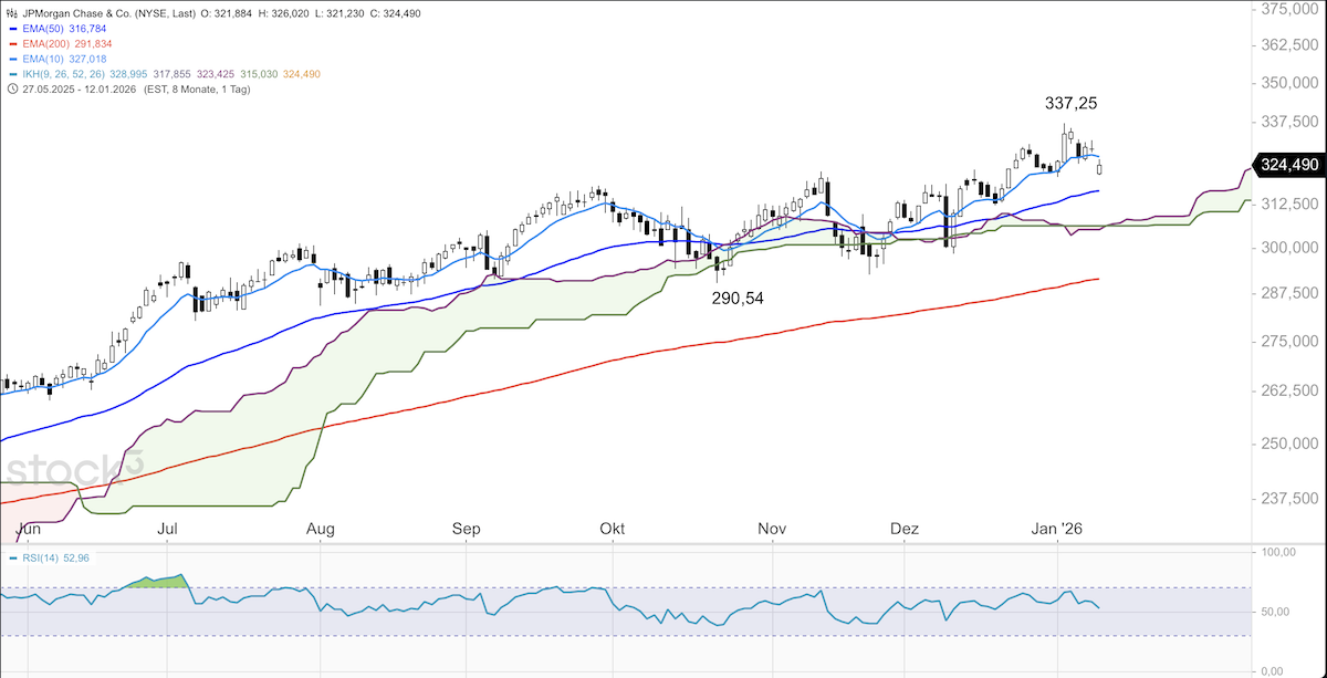 Die Zahlen zum abgelaufenen Quartal fielen gemischt aus. Der Gewinn je Aktie (EPS) lag bei 5,23 Dollar und übertraf die Erwartung der Analysten von 5,05 Dollar, während der Umsatz von 45,80 Milliarden Dollar die Prognose von 46,70 Milliarden Dollar leicht verfehlte. Der faire Wert für die JPMorgan-Papiere liegt aktuell bei etwa 355,66 Dollar, was ein weiteres Aufwärtspotenzial von etwa 7% bedeutet. Das durchschnittliche Analystenkursziel liegt aktuell bei 343,95 Dollar, das aktuelle KGV bei 16,07 was etwas über dem Branchenwert von 14,60 liegt. Charttechnisch befinden sich die JPMorgan-Papiere klar über der Ichimoku-Wolke im Tageschart, was auf langfristig eher weiter steigende Kurse bei den Titeln hindeutet. Der aktuelle Rücksetzer könnte allerdings noch etwas weiterlaufen und den 50er-EMA im Tageschart anlaufen, der derzeit bei 316,78 Dollar notiert. Der 50er-EMA gilt oft als Anlaufmarke von tieferen Korrekturen im übergeordneten Aufwärtstrend. Weitere fundamentale Chancen könnten sich für das Unternehmen durch den Apple Card-Deal ergeben. JPMorgan übernimmt das Apple Card-Programm von Goldman Sachs, inklusive rund 20 Milliarden Dollar Kreditvolumen. Zudem könnte JPMorgan von der Lockerung der US-Sanktionen gegen Venezuela profitieren und bei der Finanzierung des venezolanischen Ölsektors eine Schlüsselrolle einnehmen.