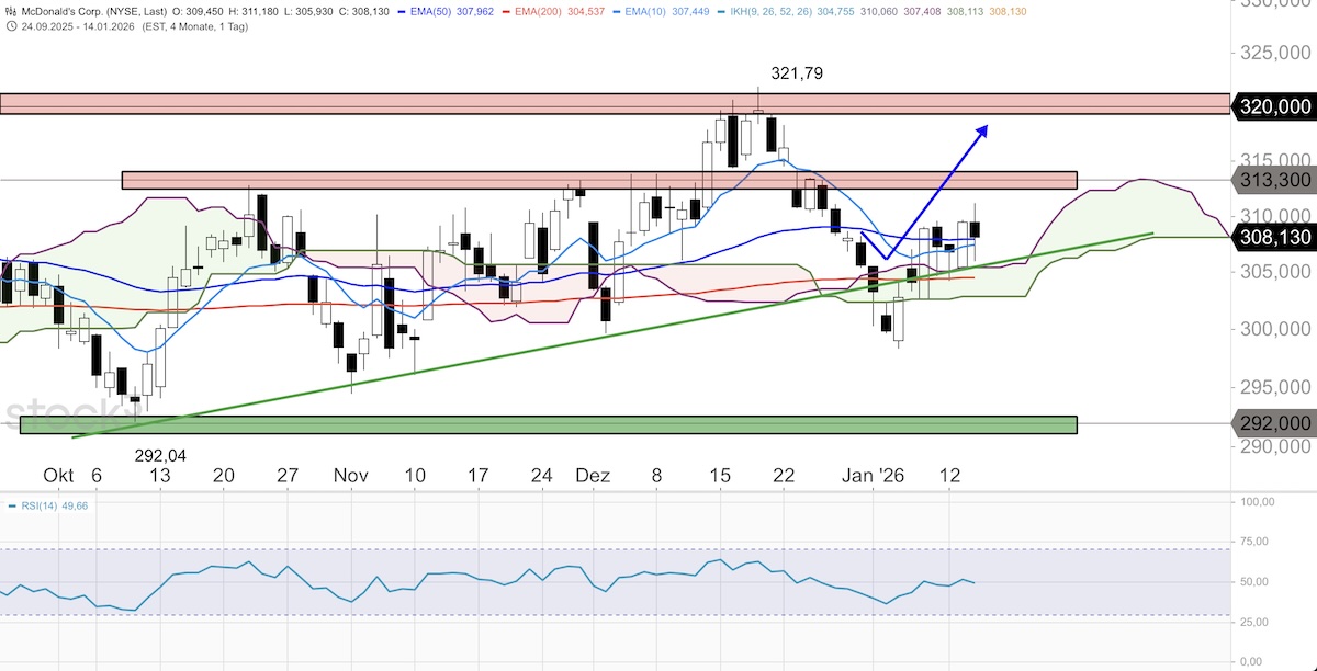 Am Vortag schlossen die McDonalds-Aktien bei 308,13 Dollar, wobei der faire Wert bei 279,20 Dollar liegt, das KGV bei 25,4 und das durchschnittliche Analystenkursziel bei 334,68 Dollar. Aus saisonaler Perspektive befinden sich die McDonalds-Papiere laut statistischen Daten der vergangenen zehn Jahre von Anfang Januar bis Ende Januar in einer bullischen Phase und könnten von weiterem Rückenwind profitieren. Von Anfang Februar bis Mitte März ist allerdings mit deutlichem saisonalen Gegenwind zu rechnen, wobei es Mitte März häufig zu einem Verlaufstief kommt. Kurzfristig sind weiter steigende Kurse zu erwarten, solange die Ichimoku-Wolke im Stundenchart bei aktuell etwa 304 Dollar verteidigt werden kann. Die nächste Zielmarke auf der Oberseite liegt zunächst am Widerstand bei 313,30 Dollar.