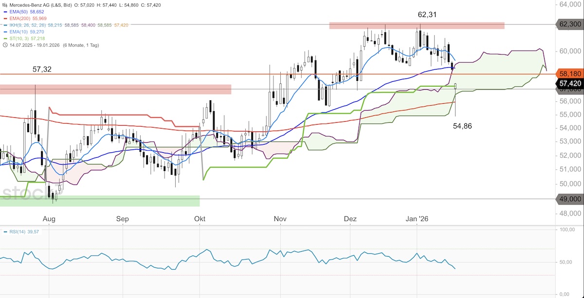 Risikohinweis: Die bereitgestellten Informationen stellen keine Aufforderung zum Kauf oder Verkauf der erwähnten Werte dar. Die besprochenen Wertpapiere sind sehr volatile und risikoreiche Anlageformen. Dies ist keine Anlageberatung, und jede Entscheidung erfolgt auf eigenes Risiko. Hinweis: Stop-Loss-Marken und Gewinnziele dienen lediglich als Orientierung und sollten an das individuelle Risiko- und Geldmanagement sowie die tagesaktuelle Marktentwicklung angepasst werden. Gewinne sollten eigenverantwortlich realisiert werden. Das Erreichen des Kursziels basiert auf dem angegebenen Zielkurs des Basiswerts. Der Autor ist zum Zeitpunkt der Analyse nicht in Mercedes-Benz investiert.