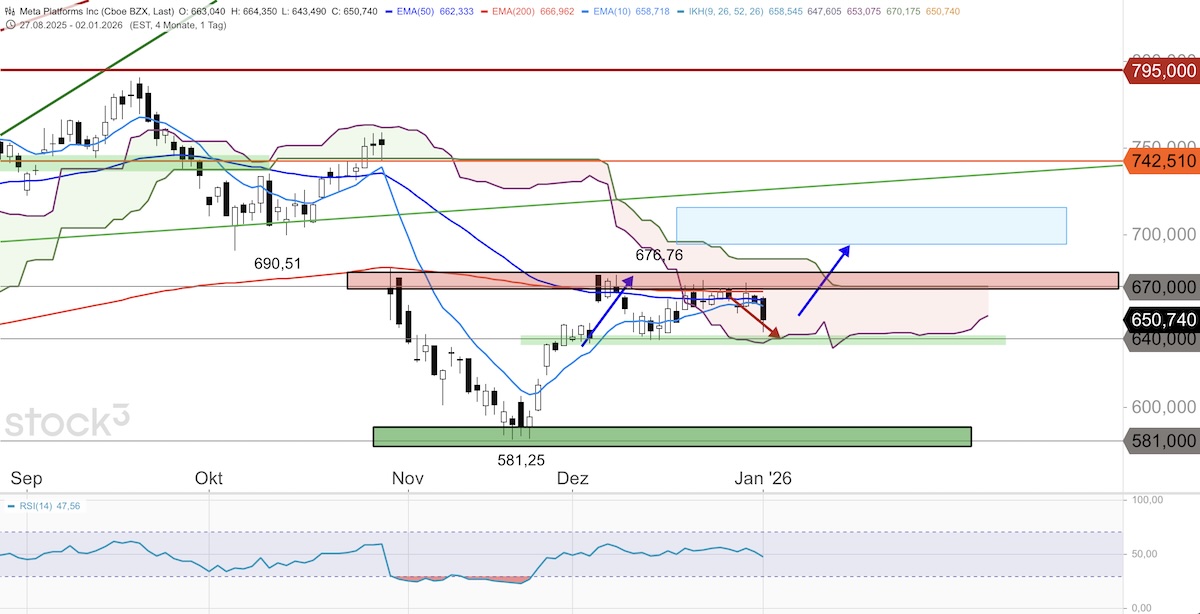 Die Meta-Aktien bewegen sich seit Ende November in einer Seitwärtsrange zwischen 640,00 US-Dollar und 675,00 Dollar.