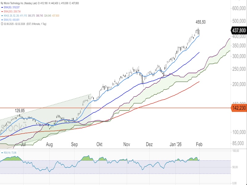 Die Aktien des Speicherelemente-Herstellers Micron Technology verfolgen weiterhin ihren langfristigen Aufwärtstrend, gleichmäßig und solide. Am Freitag erreichten sie ihr bisheriges Verlaufshoch bei 455,50 US-Dollar, bevor ein leichter Intraday-Rücksetzer einsetzte. Wie in den Vorwochen fing der 10er-EMA im Tageschart dies bei aktuell 406,68 Dollar ab, was einmal mehr die hohe Bedeutung des 10er-EMA im Tageschart im kurzfristigen Kursverlauf unterstreicht.