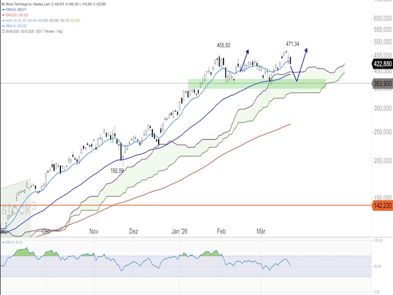Die Aktien von Micron Technology Inc., einem der weltweit führenden Hersteller von Speicherchips und Datenspeicherlösungen mit Sitz in Boise, Idaho, zeigen sich am heutigen Montag kurz nach US-Börseneröffnung knapp behauptet im Bereich von 422,60 US-Dollar, nachdem sie am Freitag bei 422,88 Dollar aus dem Handel gegangen waren. Trotz des aktuellen Rücksetzers in der übergeordnete Aufwärtstrend intakt.