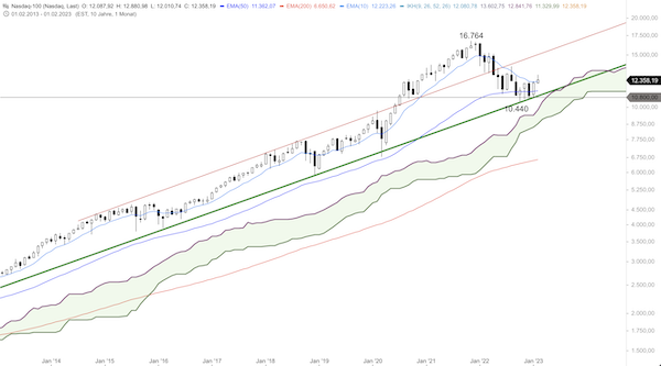 Der Nasdaq 100 konnte im übergeordneten Abwärtstrend im Oktober 2022 ein Verlaufstief bei 10.440 Punkten markieren und in diesem Bereich an der langfristigen Unterstützungslinie wieder nach oben abprallen. Im Vormonat Januar konnte der Nasdaq 100 kräftig ansteigen und die Aufwärtsdynamik bis in den Februar fortsetzen. Das bisherige Verlaufshoch der Aufwärtsbewegung wurde bei 12.880 Punkten etwas über dem 10er-EMA im Monatschart markiert. Dann ging es wieder abwärts. Aktuell zeigt sich der Nasdaq 100 im Bereich von 12.360 Punkten tiefer. Zudem mit einer bisher bärischen Monatskerze. Es könnte sich eine langfristige Short-Chance bieten.