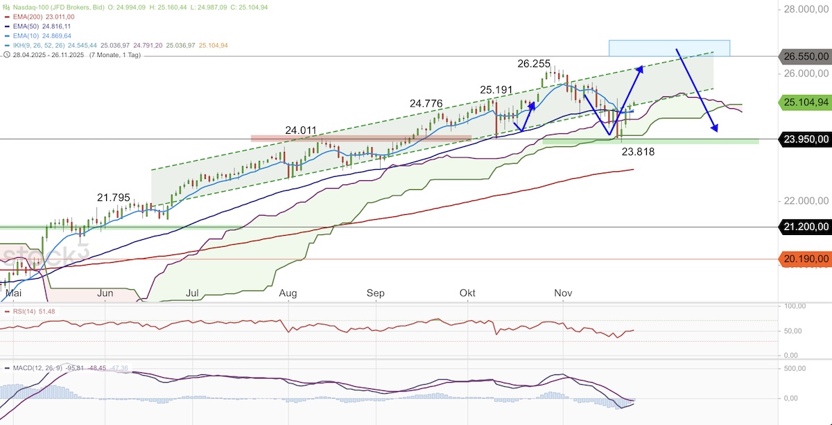 Der Nasdaq 100 ist seit dem Verlaufshoch bei 26.255 Punkten vom 30. Oktober in eine scharfe Korrektur im übergeordneten Aufwärtstrend übergegangen. Diese sollte nun mit dem Verlaufstief bei 23.818 Punkten vom 21. November beendet worden sein. Der Index sollte nun mittelfristig, unter normalen Korrekturen, vor einem weiteren Hochlauf Richtung 27.000 Punkte stehen.