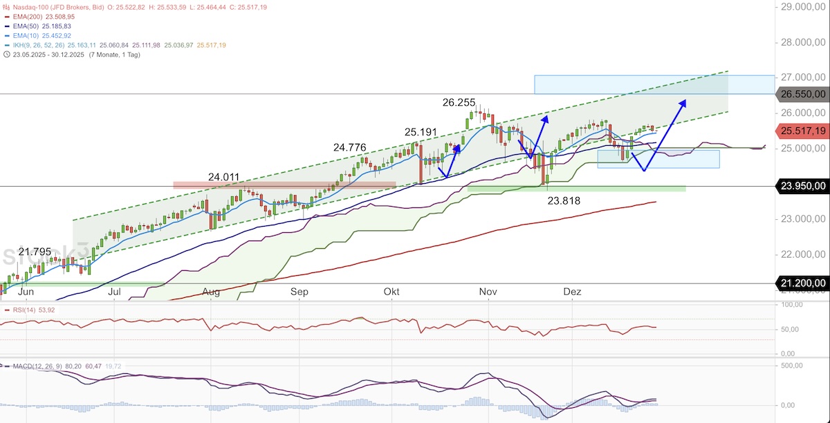 Der Nasdaq 100 hat die Korrektur am 17. Dezember mit dem Verlaufstief um 24.624 Punkte beendet und befindet sich seitdem in einem erneuten Kursanstieg. Dabei konnte der Index am 19. Dezember den wichtigen 10er-eMA nach oben durchbrechen, der aktuell bei 25.450 Punkten notiert. Aktuell bewegt sich der Index über dem 10er-EMA seitwärts, sollte aber bald einem weiteren Kursanstieg stehen und die nächste Zielzone um 27.000 Punkte ansteuern.