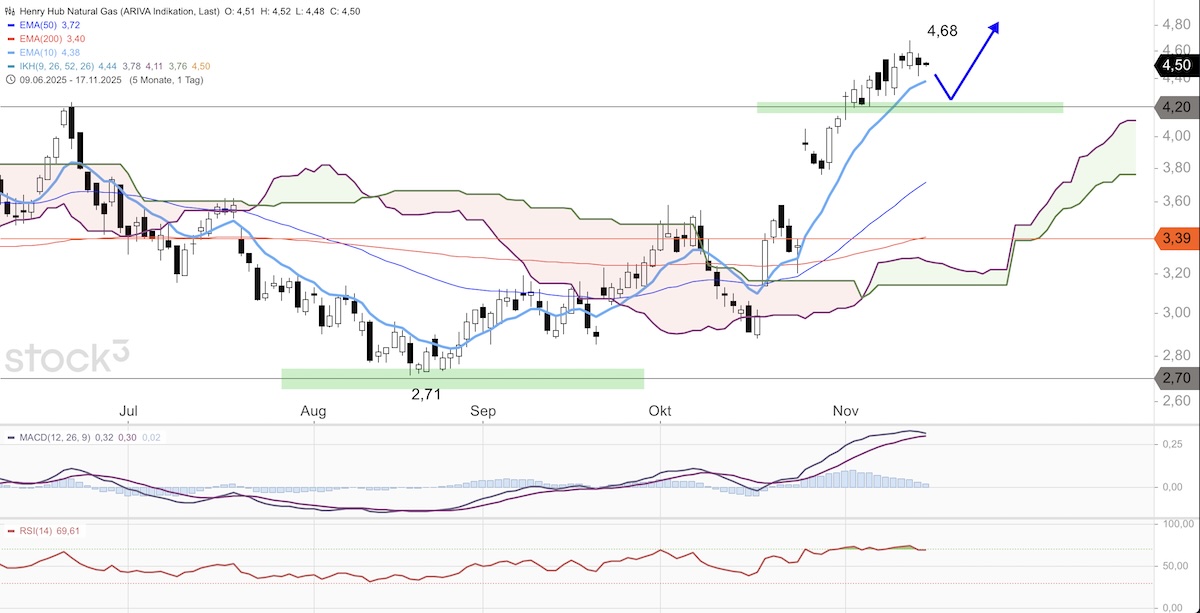 Am übergeordneten Aufwärtstrend dürfte sich so schnell nichts ändern, allerdings steht Natural Gas ab üblicherweise Ende November (oft ab dem 25. November) vor einer Korrektur. Die saisonale Schwäche ist seit Jahrzehnten zu beobachten, wobei es dann ab Januar durchschnittlich wieder aufwärtsgeht. Es handelt sich bei diesen saisonalen Daten allerdings natürlich um einen durchschnittlichen typischen Kursverlauf, der im laufenden Jahr 2025 anders ausfallen könnte. Zunächst ist die Unterstützung um 4,20 Dollar zu beachten. Solange Natural Gas bei Rückläufen darüber notiert, sind eher weiter steigende Notierungen Richtung 4,80 Dollar zu erwarten.