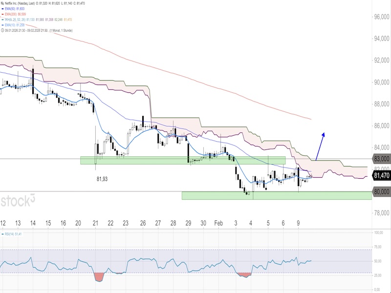 Charttechnisch notiert Netflix im Tageschart noch unter dem 10er-EMA (82,50 Dollar) und deutlich unter dem 50er-EMA (91,51 Dollar) und dem 200er-EMA (102,69 Dollar), womit der übergeordnete Abwärtstrend weiter intakt ist. Die Aktie notiert zudem unter der Ichimoku-Wolke im Tageschart, was die bearishe Lage bestätigt. Im Stundenchart zeigt sich allerdings eine mögliche Stabilisierung. Der RSI(14) notiert bei 51,41 im neutralen Bereich und der Kurs bewegt sich knapp über der massiven Unterstützungszone um 80 Dollar, die bisher gehalten hat. Das Verlaufstief bei 79,22 Dollar markiert die letzte Verteidigungslinie der Bullen. Gelingt eine Rückeroberung der Zone um 83 Dollar und ein Anstieg über die Ichimoku-Wolke im Stundenchart, wäre eine weitere charttechnische Gegenbewegung in Richtung 90 Dollar möglich. Saisonal betrachtet zeigt Netflix laut 10-Jahres-Durchschnitt eine tendenziell positive Phase von Januar bis Mitte Februar und profitiert damit noch etwas vom saisonalen Rückenwind, der einen Anstieg über die Ichimoku-Wolke im Stundenchart begünstigen könnte. Zuletzt hat Bernstein SocGen Group am 30. Januar die Aktie mit einem Buy-Rating und einem Kursziel von 115 Dollar bestätigt. Freedom Capital Markets hat das Papier am 27. Januar auf Buy hochgestuft mit einem Kursziel von 104 Dollar. Die nächsten Quartalsergebnisse werden am 21. April 2026 erwartet.