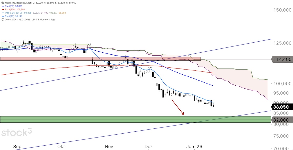 Risikohinweis: Die bereitgestellten Informationen stellen keine Aufforderung zum Kauf oder Verkauf der erwähnten Werte dar. Die besprochenen Wertpapiere sind sehr volatile und risikoreiche Anlageformen. Dies ist keine Anlageberatung, und jede Entscheidung erfolgt auf eigenes Risiko. Hinweis: Stop-Loss-Marken und Gewinnziele dienen lediglich als Orientierung und sollten an das individuelle Risiko- und Geldmanagement sowie die tagesaktuelle Marktentwicklung angepasst werden. Gewinne sollten eigenverantwortlich realisiert werden. Das Erreichen des Kursziels basiert auf dem angegebenen Zielkurs des Basiswerts. Der Autor ist zum Zeitpunkt der Analyse nicht in Netflix investiert.