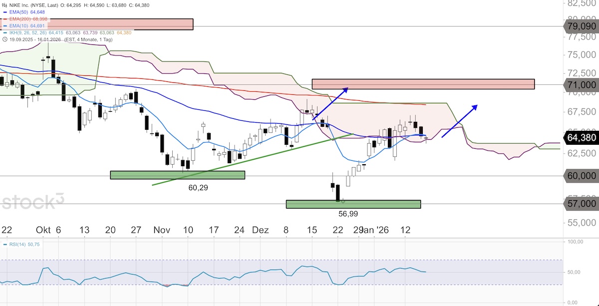 Unter kurzen Rücksetzern konnten die Aktien in der laufenden Erholung bis etwa 67,20 Dollar ansteigen und stehen nun kurz vor einem Durchbruch aus der Ichimoku-Wolke im Tageschart nach oben. Am Vortag gingen die Titel bei 64,38 Dollar aus dem Handel. Die Aktien mit einem KGV von 41,44, einem durchschnittlichen Analystenkursziel von 76,45 Dollar und einem fairen Wert von 66,70 Dollar könnten nach dem jüngsten Rücksetzer und der bullischen Vortageskerze vor einem weiteren Kursanstieg stehen. Dabei könnten die NIKE-Papiere auch von der bullischen Saisonalität profitieren, die üblicherweise noch bis Ende Januar anhält. Kurzfristig wäre es für die Aktien wichtig, die Ichimoku-Wolke im Stundenchart zurückzuerobern. Die Jefferies-Analysten hatten in der Vorwoche ihr Kursziel um 110 Dollar mit der Einstufung Buy bestätigt. Am heutigen Montag bleiben die US-Börsen aufgrund des Feiertags Martin-Luther-King-Day geschlossen. Der nächste reguläre Börsentag ist der morgige Dienstag, der 20. Januar 2026.