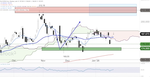 Allerdings mit einer bearishen Tageskerze und erneut nur leicht unter der oberen Begrenzung der Ichimoku-Wolke im Tageschart um 191,00 Dollar. Damit sich die Lage langfristig aufhellt, müssen die Papiere nachhaltig aus der Ichimoku-Wolke im Tageschart nach oben ausbrechen. In diesem Fall könnten die Titel mit einem KGV von 40,08, einem fairen Wert von 203,30 Dollar und einem durchschnittlichen Analystenkursziel von 259,67 Dollar weiter Kurs auf die Widerstandszone um 212,50 Dollar nehmen. Im Stundenchart ist der Ausbruch aus der Ichimoku-Wolke bereits gelungen, was den Titeln weiteren Auftrieb geben könnte. Und saisonal betrachtet könnten die Aktien zudem noch bis Mitte Februar vom saisonalen Rückenwind profitieren.