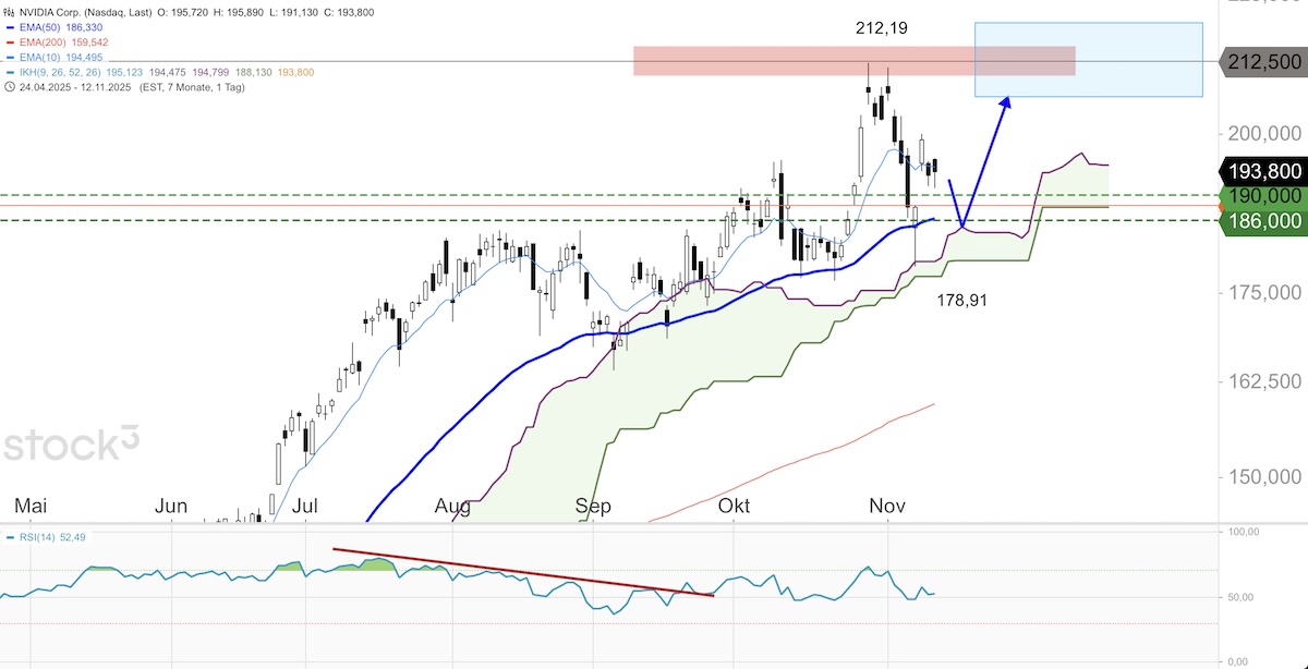 Die Aktien des Chipherstellers NVIDIA befinden sich seit Monaten in einem stabilen Aufwärtstrend. Nach dem Abprall am Widerstandsbereich um 212,50 Dollar Ende Oktober und Anfang November fielen die Papiere am Freitag der Vorwoche bis auf 178,91 Dollar zurück, konnten sich anschließend jedoch deutlich erholen und den Handel mit einer sehr bullischen Tageskerze mit langem unteren Schatten beenden.