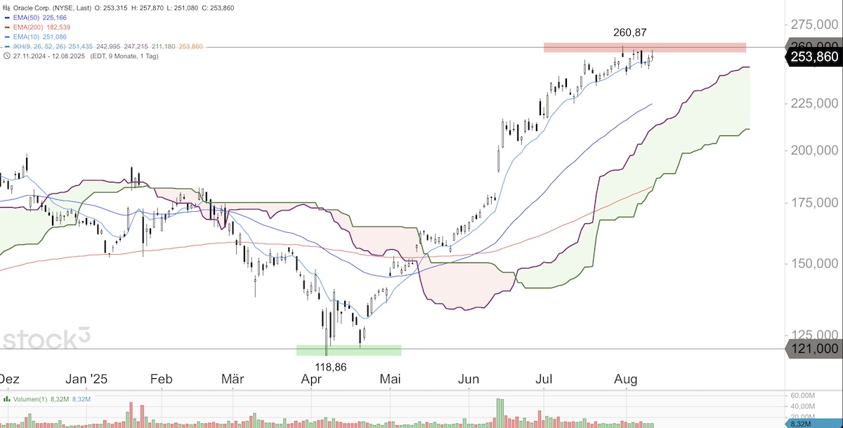 Derzeit stoßen die Oracle-Aktien jedoch am Widerstand um 260 Dollar an ihre Grenzen. An dieser Marke prallten die Titel bereits mehrfach nach unten ab, zuletzt am Vortag, als sie nach einem erneuten Rücksetzer mit einer bearishen Tageskerze aus dem Handel gingen. Auffällig ist auch die Ichimoku-Wolke im Stundenchart, die seit Beginn der Rally im April nicht unterschritten wurde. Mittlerweile hat sie sich jedoch deutlich ausgedünnt, sodass bereits ein kleiner Kursrückgang genügen könnte, um sie nachhaltig zu durchbrechen und damit ein Verkaufssignal auszulösen. In diesem Fall wäre eine Korrektur im übergeordneten Aufwärtstrend wahrscheinlich.