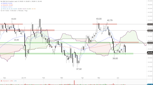 Die Aktien von RWE sind in den vergangenen Handelstagen an der Unterstützung bei 39 Euro nach oben abgeprallt und konnten sich bis zum 200er-EMA erholen. Ein nachhaltiger Durchbruch nach oben gelang den Titeln aber nicht. Am Vortag gingen die Aktien mit einer bärischen Tageskerze am 200er-EMA aus dem Handel. Diese bärische Tageskerze wird am heutigen Dienstag bestätigt.