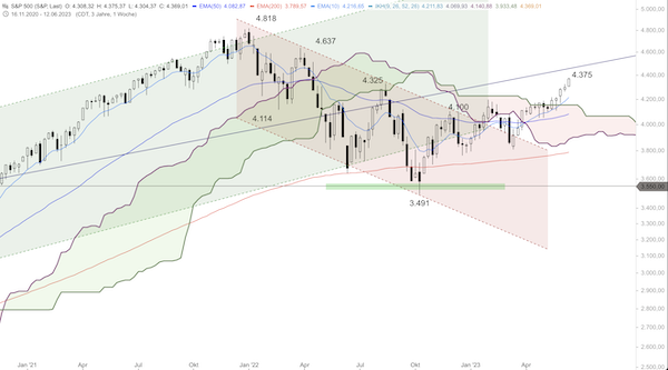 Der SP500 konnte in den vergangenen Handelswochen kräftig zulegen und ging am Vortag im Bereich von 4.370 Punkten aus dem Handel. Damit nähert sich der Index der Marke von 3.400 Punkten. Nur kurz darüber befindet sich der obere Fibonacci-Fächer im Wochenchart bei aktuell etwa 4.460 Punkten.