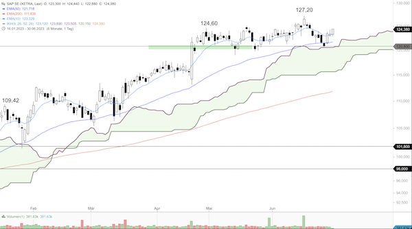 Die Aktien von SAP befinden sich in einem langfristigen Aufwärtstrend und konnten bisher bis 127,20 Euro ansteigen. In der Folge sackten die Papiere aber wieder ab und führten eine Korrektur im Aufwärtstrend bis 120,58 Euro durch. Dann startete eine Erholung, wobei die Papiere am Vortag mit einer bärischen Tageskerze leicht über dem 10er-EMA aus dem Handel gingen. Diese bärische Tageskerze wurde heute aber nicht bestätigt, es geht direkt weiter aufwärts.