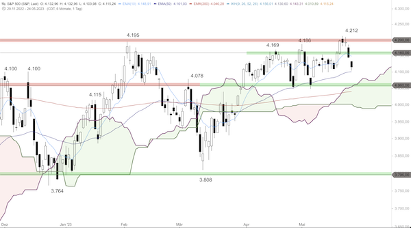 In der vorherigen Analyse hieß es: "Auf der Unterseite ist der SP 500 durch den 50er-EMA bei 4.100 Punkten und den Bereich bei 4.060 Punkten unterstützt. Zudem dehnt sich die Ichimoku-Wolke weiter nach oben aus und deutet damit eher weiter steigende Kurse an. Der Rücklauf hat begonnen, sollte aber weiterhin nur eher temporär stattfinden. Ein Trendwechsel auf Short ist bisher noch nicht zu erkennen, lediglich eine normale Korrektur nach dem vorherigen Hochlauf. Im Blick steht dabei weiterhin die Entwicklung im US-Schuldenstreit. Dadurch könnte es noch zu einer erhöhten Volatilität kommen. Solange der SP500 aber mittelfristig über dem 50er-EMA und langfristig über der Ichimoku-Wolke notiert, ist mit eher weiter steigenden Kursen nach der laufenden Korrektur zu rechnen." Der 50er-EMA wurde verteidigt, der SP500 könnte nun vor einem erneuten Hochlauf zunächst bis zum offenen Gap bei 4.142 Punkten und in der Folge zum Widerstand bei 4.160 Punkten stehen. Es bietet sich eine Long-Chance.