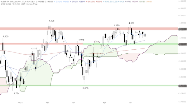 Auf der Unterseite ist der SP 500 durch den 50er-EMA bei 4.080 Punkten und den Bereich bei 4.060 Punkten unterstützt. Zudem dehnt sich die Ichimoku-Wolke weiter nach oben aus und deutet damit eher weiter steigende Kurse an. Auf der Oberseite befindet sich der nächste Widerstand bei 4.160 Punkten. Gelingt dem SP 500 hier ein Durchbruch nach oben, wäre mit einem weiteren Anstieg bis zum Widerstand bei 4.200 Punkte zu rechnen. Rücksetzer könnten zum Aufbau einer Long-Position verwendet werden.