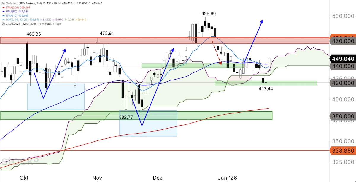Die Aktien sind am Vortag nämlich nicht nur über den 10er- und 50er-EMA bei 439,68 Dollar und 442,38 Dollar, sondern auch erneut über die Ichimoku-Wolke im Tageschart angestiegen. Zudem sind die Papiere mit einer bullischen, langen Tageskerze bei 449,04 Dollar aus dem Handel gegangen. Die Tesla-Aktien sollten nun weiter hochlaufen und den Ausbruch aus der Ichimoku-Wolke im Tageschart verfestigen. Positiv ist zudem der gleichzeitige Ausbruch aus der Ichimoku-Wolke nach oben im Stundenchart. Das Papier mit einem KGV von 271,6, einem fairen Wert von 292,49 Dollar und einem durchschnittlichen Analystenkursziel von 415,86 Dollar könnte dabei weitermachen und Kurs auf das obere offene Gap bei 474,98 Dollar nehmen, wo sich auch ein massiver Widerstand befindet. Solange die Ichimoku-Wolke im Tageschart hält, sollten die Aktien weiter zulegen können. Saisonal betrachtet sollten die Tesla-Papiere laut Daten der vergangenen 10 Jahre noch bis Anfang Februar mit Rückenwind fahren können, bevor es dann eher wieder bis Mitte März und dann erneut ab Mitte April bis Ende Mai zu Gegenwind kommt.