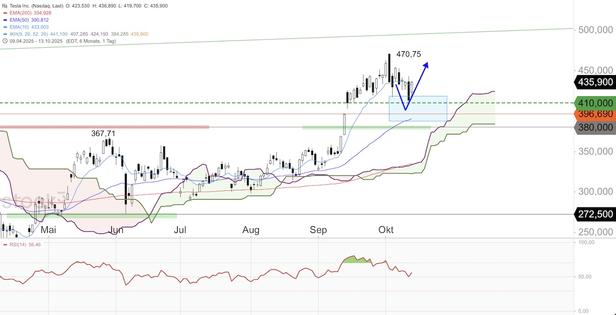 Die Aktien des Autoherstellers Tesla befinden sich seit Mai wieder über den Ichimoku-Wolken im Tageschart und signalisierten damit eine langfristige Stärke. Dieses Stärkesignal wurde im bisherigen Kursverlauf bestätigt, und die Tesla-Aktien konnten bis Anfang Oktober auf bis zu 470,75 Dollar ansteigen. In der Folge setzte eine Korrektur ein, welche die Papiere leicht unter den 10er-EMA im Tageschart zurückführte, der aktuell bei 433 Dollar verläuft.