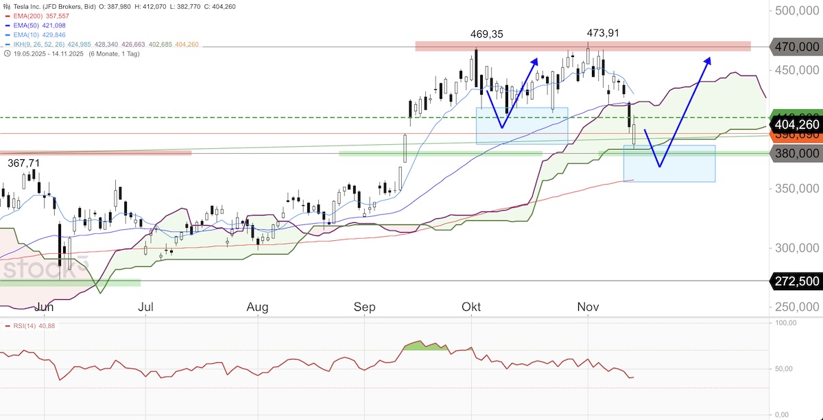 Die Aktien des Autoherstellers Tesla sind in den Vorwochen zweimal am Widerstand um 470 US-Dollar nach unten abgeprallt und nach dem Verlaufshoch bei 473,91 US-Dollar vom 03. November erneut stark unter Druck geraten. Am Freitag konnten sich die Papiere an der unteren Begrenzung der Ichimoku-Wolke im Tageschart bei 383,60 Dollar fangen und von hier wieder deutlich hochziehen. Die Aktien gingen mit einer bullischen Tageskerze bei 404,26 Dollar aus dem Handel.