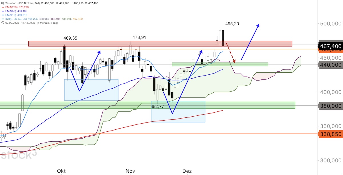 Der faire Wert der Tesla-Aktien wird aktuell bei etwa 305 Dollar gesehen, während das durchschnittliche Analystenkursziel bei rund 411 Dollar liegt. Kurzfristig dürfte sich die Korrektur innerhalb des übergeordneten Aufwärtstrends fortsetzen. Zunächst sollte das untere offene Gap bei 462,92 Dollar geschlossen werden. Bei anhaltender Schwäche wäre anschließend ein Rücklauf zum 10er-EMA im Tageschart bei aktuell 459,31 Dollar sowie zur Unterstützungszone um 440 Dollar zu erwarten. In diesem Bereich dürfte die Korrektur voraussichtlich auslaufen. Im Anschluss sollten die Tesla-Aktien wieder in den übergeordneten Aufwärtstrend zurückfinden und zu einem erneuten Hochlauf ansetzen. In diesem Szenario wäre auch ein nachhaltiger Ausbruch über den Widerstand bei 500 Dollar wahrscheinlich.