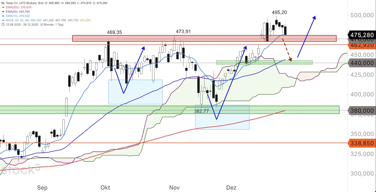 Die Tesla-Papiere könnten zunächst weiter Kurs auf das offene Gap bei 462,92 USD nehmen, welches vom 12. auf den 15. Dezember entstand. Dieses Gap sollte zunächst geschlossen werden. Sollten die Papiere mit einem fairen Wert von etwa 305 Dollar und einem durchschnittlichen Analystenkursziel von 411 Dollar weiter nachgeben, wäre der 50er-EMA um 443,80 USD mit der Unterstützungszone um 440 Dollar die nächste Zielmarke. Wahrscheinlich wird die Korrektur in diesem Bereich und noch über der Ichimoku-Wolke im Tageschart auslaufen, bevor dann der übergeordnete Aufwärtstrend Richtung 500 Dollar wieder aufgenommen wird.