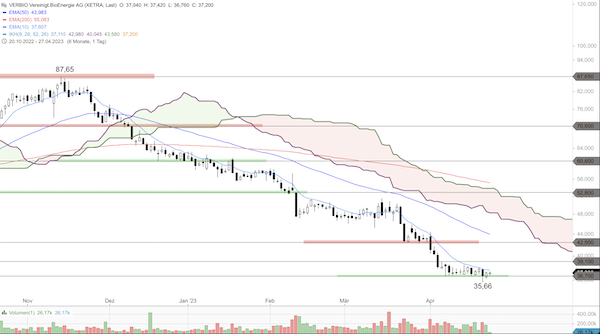 Die Aktien des Bioenergieproduzenten Verbio befinden sich weiter in einem langfristigen Abwärtstrend und pendeln um die Unterstützung um 36,70 Euro sowie unter dem wichtigen 10er-EMA im Tageschart bei aktuell 37,60 Euro. Bisher liefen Erholungen im Abwärtstrend immer wieder im Bereich des 10er-EMA aus. Es könnte sich eine Short-Position in Trendrichtung auf die Papiere von Verbio anbieten.