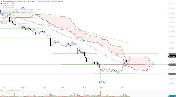 Die Aktien von Verbio konnten in den Vorwochen im Bereich von 32 Euro einen Boden bilden und dann eine Aufwärtsbewegung einleiten, die mehr und mehr an Dynamik gewann und am heutigen Dienstag zum Ausbruch aus der Ichimoku-Wolke nach oben geführt hat. Womit ein langfristiges Long-Signal generiert wurde.