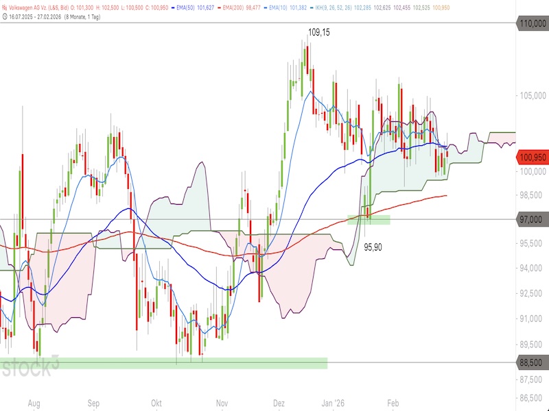 Charttechnisch zeigt sich bei den VolkswagenPapieren ein gemischtes Bild. Der Kurs notiert leicht unterhalb der 10er-EMA (101,38 Euro) und der 50er-EMA (101,63 Euro). Die Ichimoku-Wolke, deren untere Begrenzung bei rund 99,50/100,50 Euro verläuft, wurde noch nicht nachhaltig nach unten durchbrochen. In diesem Fall würde ein Verkaufssignal entstehen. Auf der anderen Seite, würde den Papieren von Volkswagen ein nachhaltiger Anstieg über die obere Begrenzung der Ichimoku-Wolke im Tageschart bei aktuell etwa 101,50 Euro gelingen, würde sich die Lage direkt weiter aufhellen und ein Anstieg zum Widerstandsbereich um 105,00 Euro wahrscheinlich werden. Bei einem Durchbruch nach unten aus der Wolke wäre der 200er-EMA die nächste Auffangmarke, der aktuell um 88,50 Euro verläuft. Fundamental bieten die Volkswagen-Aktien auf dem aktuellen Kursniveau eine historisch günstige Bewertung. Das KGV (2025) liegt bei 9,78 und damit deutlich unter dem Marktdurchschnitt von 17,04. Das Kurs-Buchwert-Verhältnis beträgt lediglich 0,23, die Dividendenrendite liegt bei attraktiven 6,3 Prozent. Die Mehrheit der 21 Analysten empfiehlt die Aktien zum Kauf (12 Buy, 8 Hold, 1 Sell) mit einem durchschnittlichen Kursziel von rund 116 Euro. Die nächsten Quartalszahlen sind für den 10. März 2026 geplant.