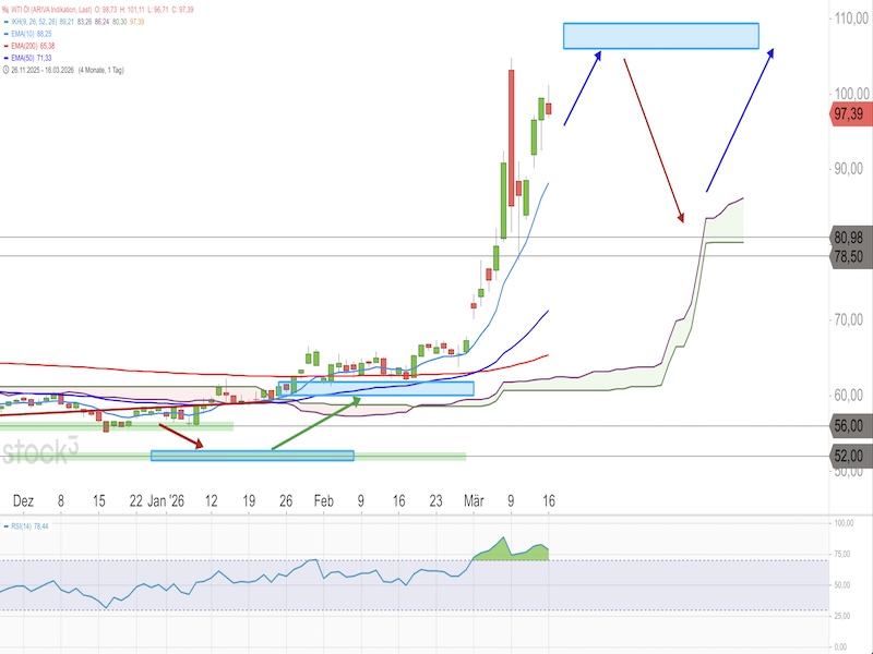 Rohöl der Sorte WTI (West Texas Intermediate) hat seit Ende Februar eine massive Rallye hingelegt. Auslöser war der Konflikt zwischen den USA und dem Iran, der die Exporte aus der Golfregion um rund 20 Prozent einbrechen ließ und die Spot-Charterraten für LNG-Tanker von 40.000 auf bis zu 300.000 US-Dollar je Tag nach oben katapultierte. Am heutigen Montag notiert WTI-Öl bei rund 97,00 Dollar je Barrel, Öl der Sorte Brent bei 103,49 Dollar.