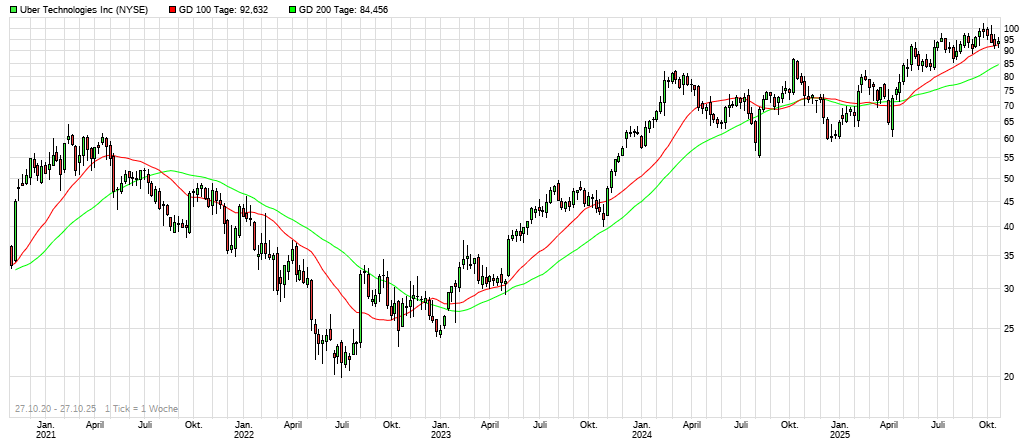 Die Aktie von Uber Technologies Inc. (ISIN: US90353T1007) stand zuletzt verstärkt im Rampenlicht. Am 24. Oktober schloss der Titel bei 94,07 Dollar, seit Jahresbeginn beträgt das Plus rund 56 Prozent. Anleger richten den Blick aktuell auf die Q3-Zahlen, die am 4. November vor Börsenstart veröffentlicht werden. Das Unternehmen hat den Termin offiziell bestätigt.