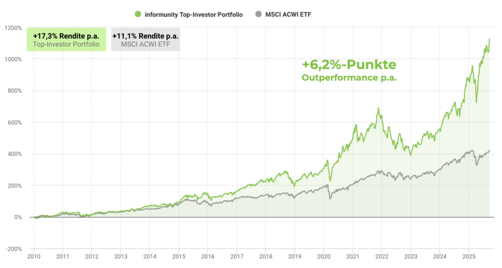 Während quantitative Anlagestrategien häufig auf reinen Backtests basieren, stützt sich der CoIQ-Ansatz auf die 15-jährige Echtzeit-Historie des informunity Top-Investor Portfolios. Seit 2010 hat das auf den Anlageentscheidungen der besten informunity-Teilnehmer basierende Portfolio eine jährliche Rendite von rund 17 % erzielt – rund sechs Prozentpunkte mehr als der Weltaktienmarkt, gemessen am MSCI AC World ETF. Diese empirisch belegte Datenbasis verleiht dem Fonds eine statistisch robuste Grundlage.
